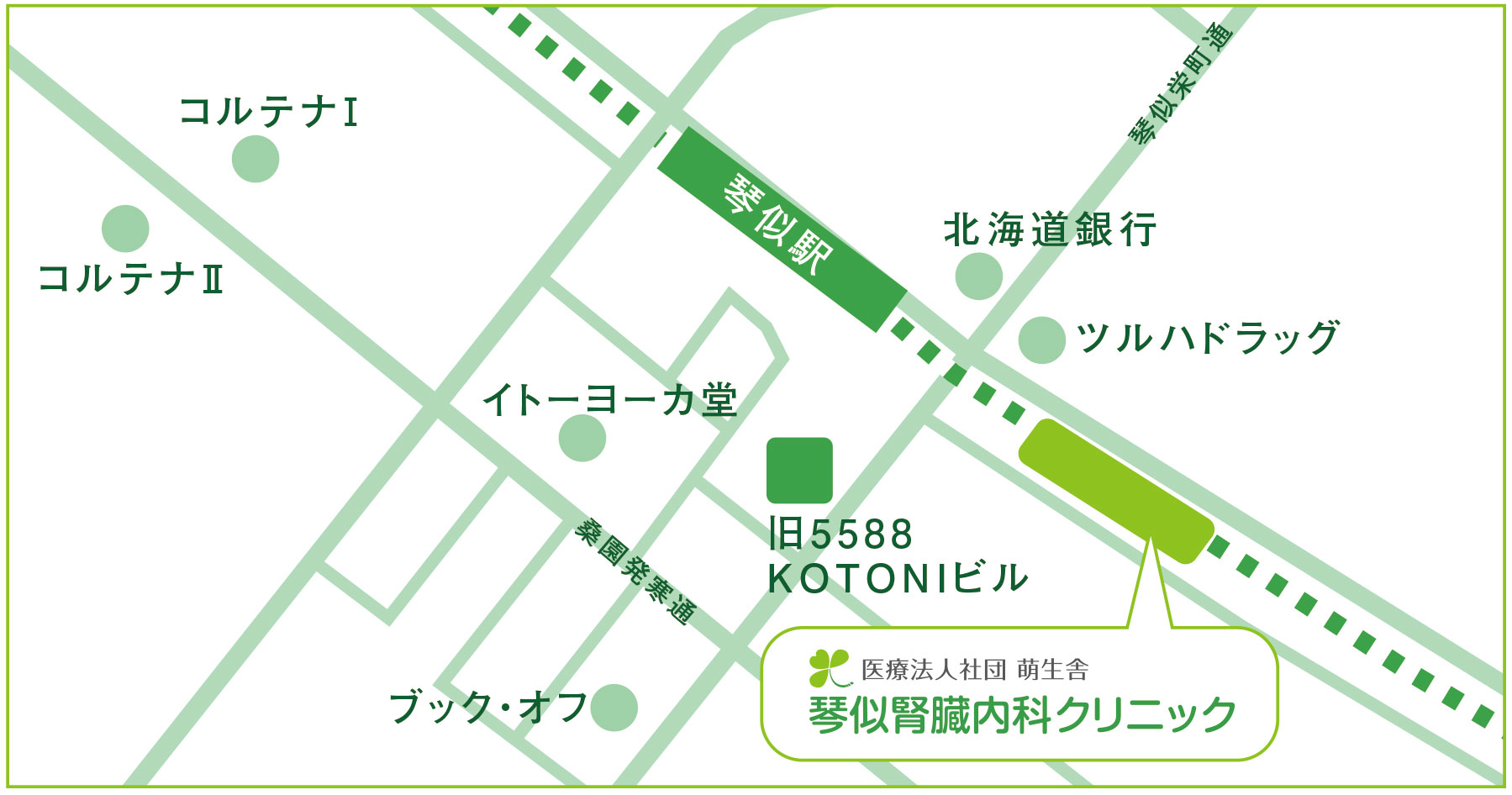 琴似腎臓内科クリニックはJR琴似駅東側にあり、地下鉄からも徒歩圏内ですので、琴似地区の方々はもちろん、JRや地下鉄ご利用の皆様にも通院しやすい立地です。